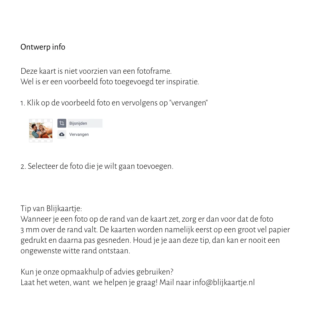 Maak je eigen ontwerp met foto en gebruik daarvoor dit kaartje als uitgangspunt. Op deze kaart is geen frame gebruikt, maar de voorbeeld foto kun je eenvoudig vervangen door een eigen persoonlijke foto. Zie de binnenzijde van de kaart voor de werkwijze en een belangrijke tip om je foto op de juiste manier op de kaart te plaatsen.