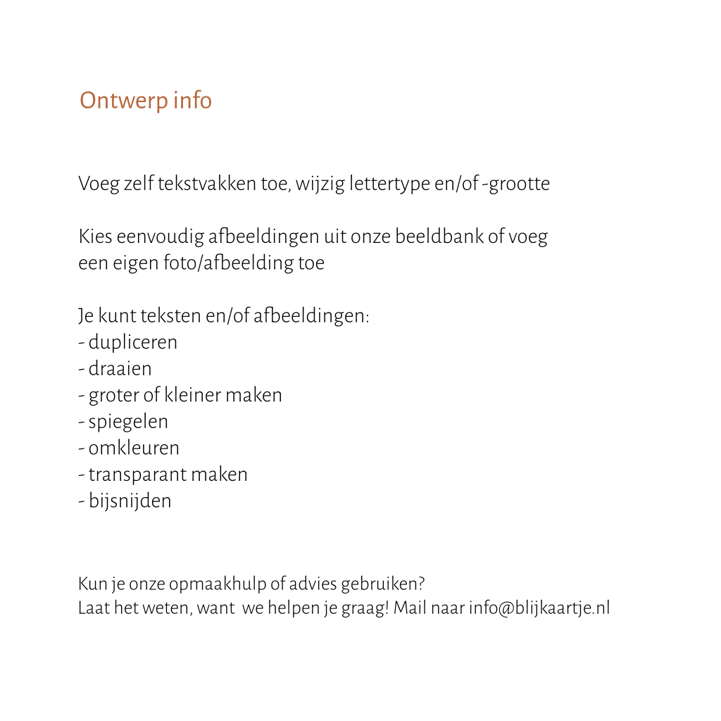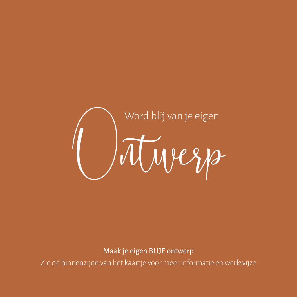 Roestbruin is helemaal dé trendkleur van nu! Maak je eigen unieke kaartje. Pas het kaartje aan naar je eigen wensen door te variëren met verschillende lettertypes en voeg eenvoudig afbeeldingen toe uit onze beeldenbank.