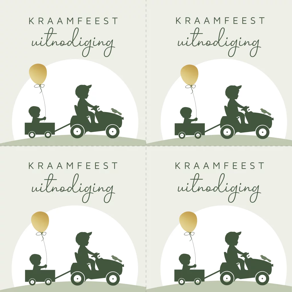 Deze minikaartjes zijn perfect voor het aankondigen van de babyborrel voor de geboorte van jullie zoon. Extra leuk om deze minikaartjes toe te voegen in de stijl van het geboortekaartje. Op de minikaartjes zie je een silhouet van twee broertjes. Grote broer rijdt op de tractor en het kleine broertje zit in de kar en houdt een ballon vast. De teksten, kleuren en lettertypes kun je naar je eigen wensen aanpassen in de online editor.