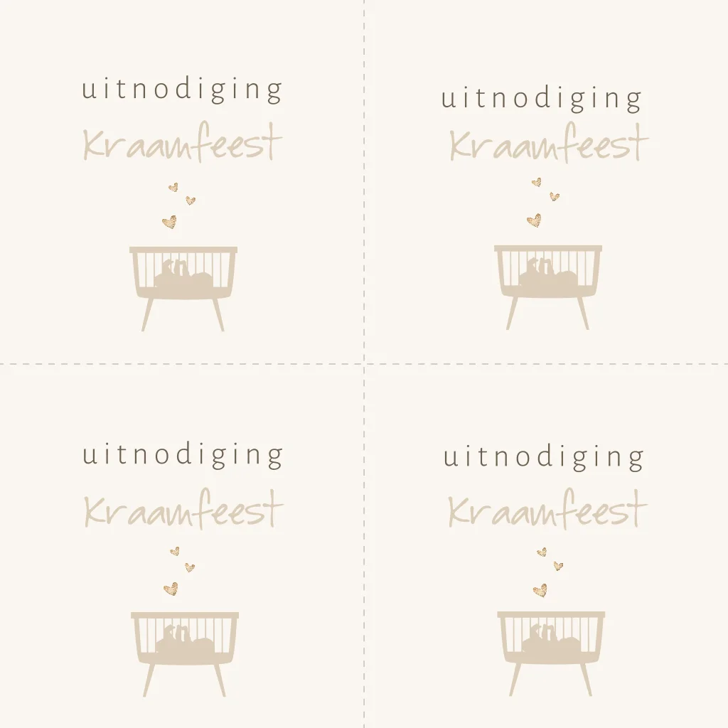Wil je een kraamfeest of babyborrel geven en dit vermelden op een apart kaartje bij je geboortekaartje? Voeg dan dit silhouet minikaartje als uitnodiging toe. Nodig met deze minikaartjes verschillende gasten uit voor jullie gezellige babyborrel en geniet van het voorstellen van jullie pasgeboren baby. Op deze minikaartjes zie je een silhouet van een kindje dat in een wieg ligt met lieve hartjes erboven. Deze DIY minikaartjes zijn eenvoudig te snijden of te knippen. Het gehele ontwerp kun je naar eigen wens aanpassen in de online editor.
