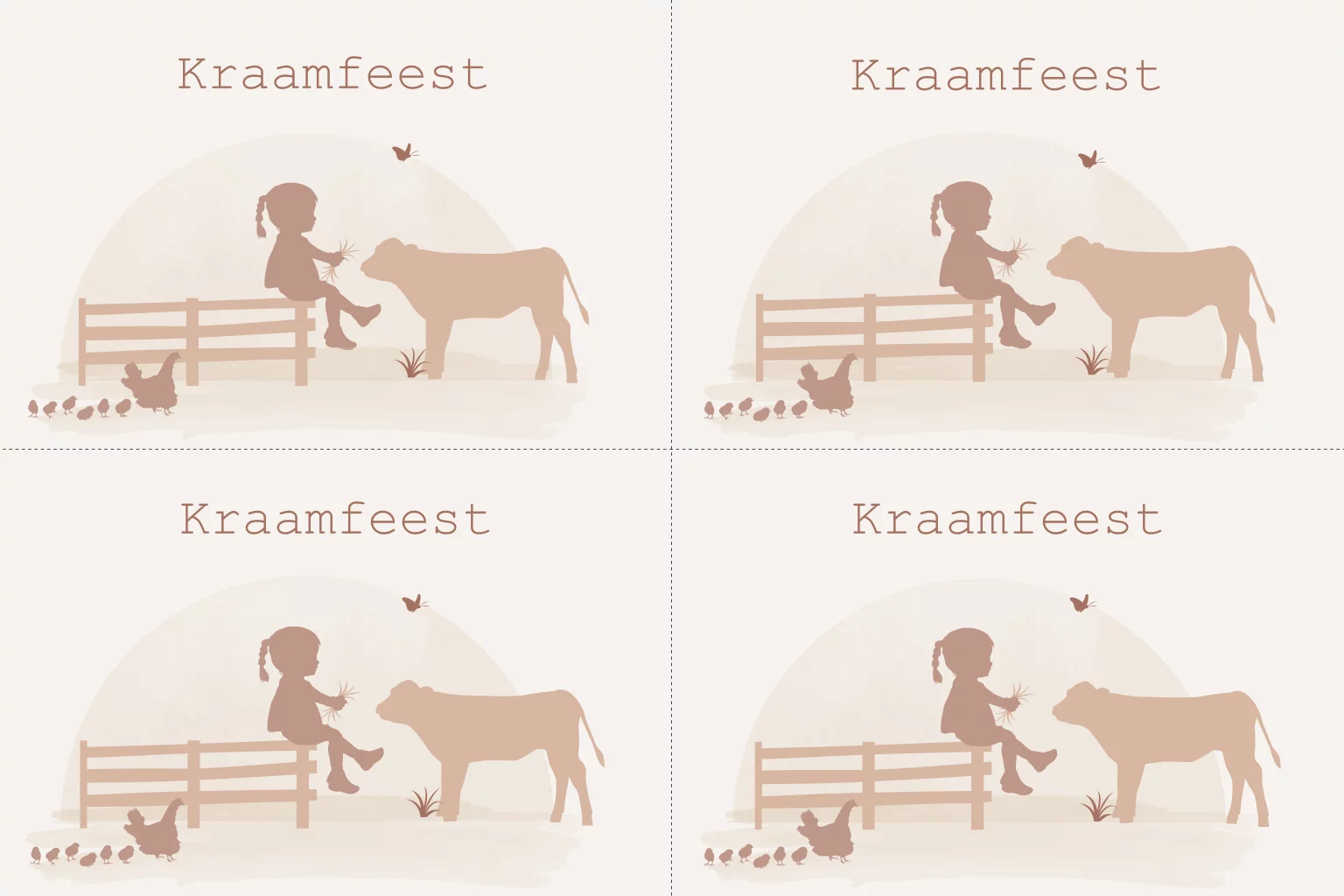 Met deze kraamborrel minikaartjes voeg je een leuke babyborrel uitnodiging toe aan jullie geboortekaartje. Deze DIY uitnodiging kun je zelf uitsnijden of knippen. Je ziet een leuk boerderijthema in beige en bruine tinten met een meisjes silhout. De teksten, kleuren en lettertypes van de minikaartjes kun je naar eigen wens aanpassen in de online editor.