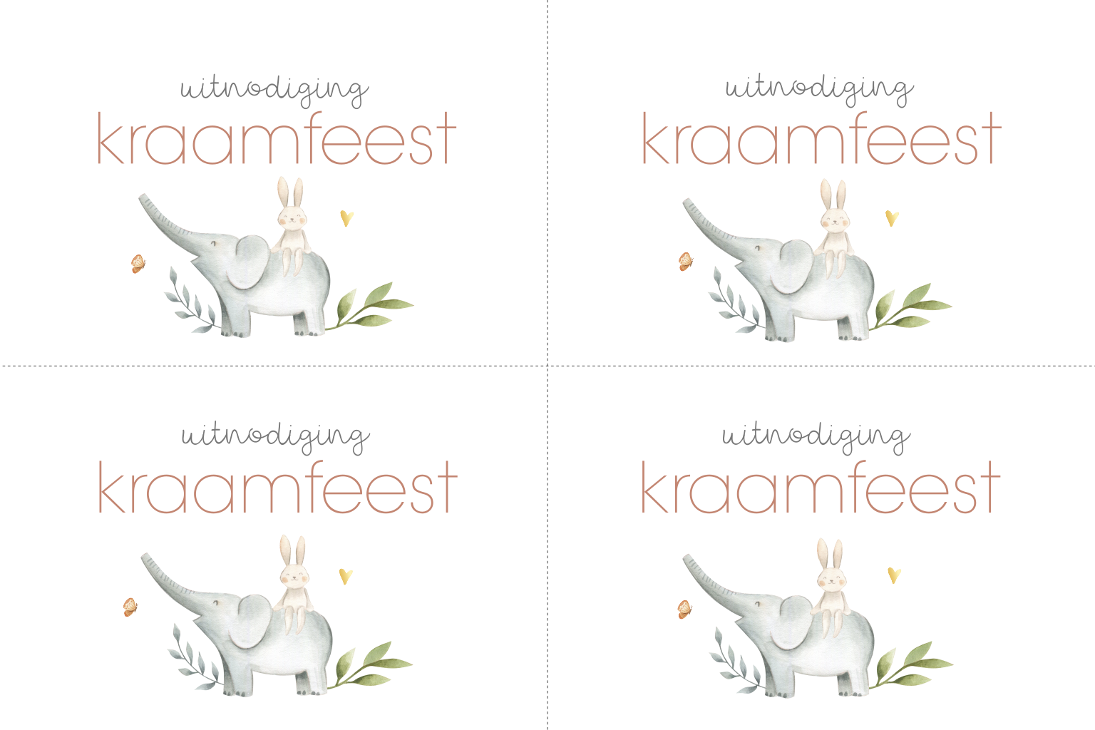 Wil je een babyborrel of kraamfeest geven en dit vermelden op een apart kaartje bij je geboortekaartje? Dat kan met deze DIY mini kaartjes. Op deze kraamfeest uitnodiging staat een lief olifantje met een konijntje op zijn rug, enkele kleine takjes, een vlindertje en hartje.