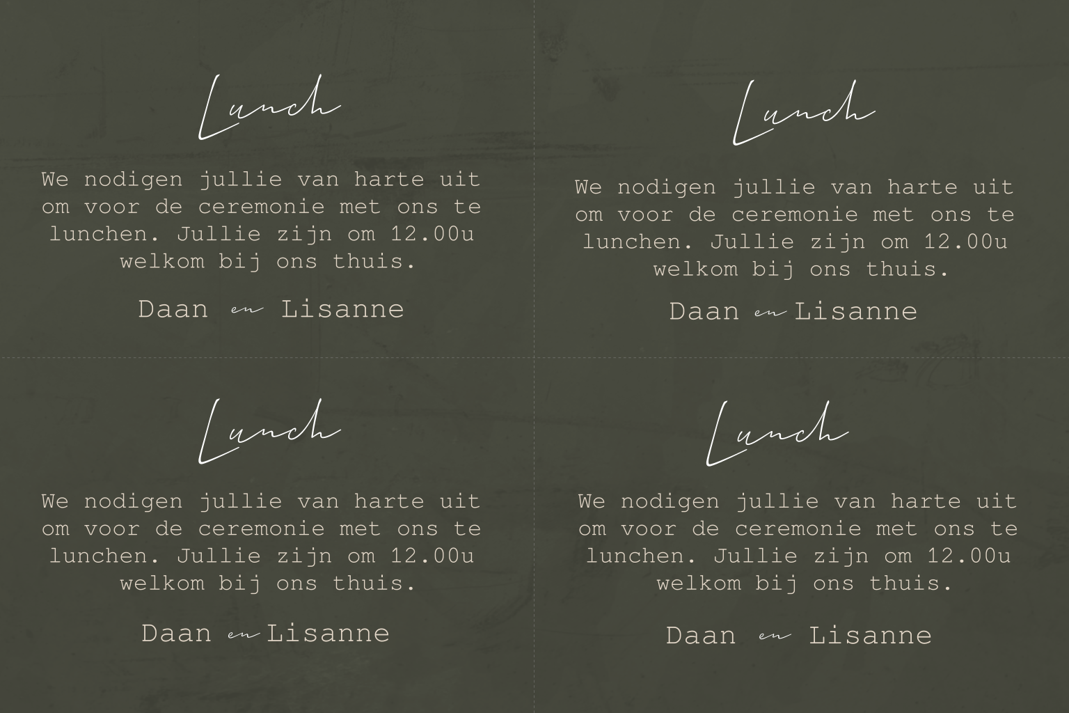 Wil je je bruiloft gasten nog wat extra informatie verstrekken? Dan zijn deze DIY minikaartjes ideaal! Onze minikaartjes zijn perfect voor het uitnodigen van je gasten voor een lunch. Je kunt de kaartjes naar je eigen wens aanpassen.