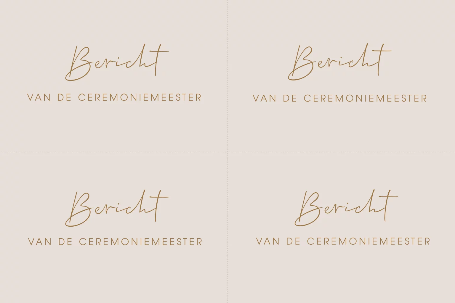 DIY minikaartjes met extra informatie voor bij de trouwkaart van de ceremoniemeester. Deze kaartjes hebben een neutraal basic design.Totaalprijs: 0 |