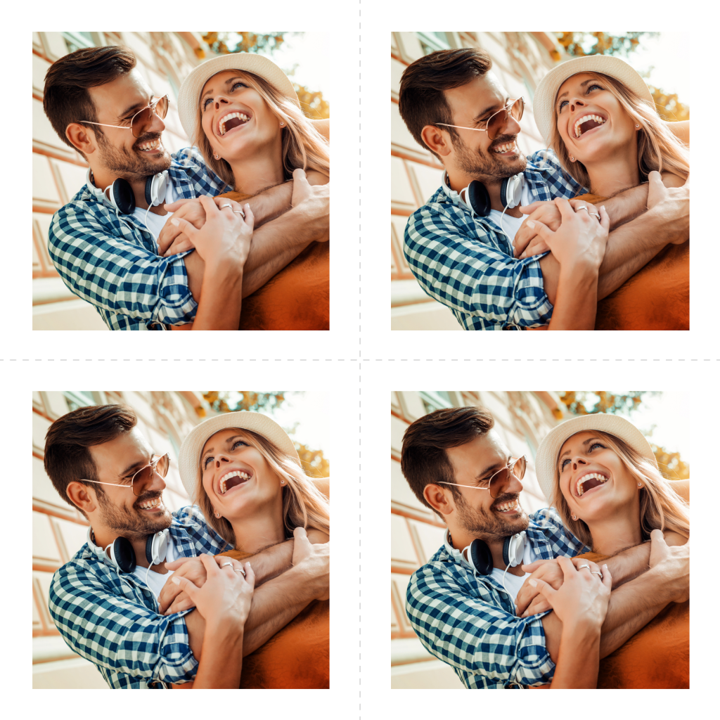Uit één 15 x 15 cm kaart haal je vier kaartjes van 7,5 cm x 7,5 cm. Door middel van de stippellijn kun je de vier kaartjes gemakkelijk opmaken. De snijtekens op de achterkant worden gedrukt, zodat je de kaartjes goed kunt snijden. De stippellijn op de voorkant en achterkant worden niet gedrukt.