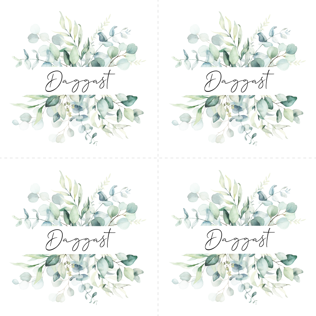 Minikaartjes met programma voor de daggasten voor bij de trouwkaart. Deze minikaartjes met botanische bladeren kun je naar je eigen wens aanpassen.