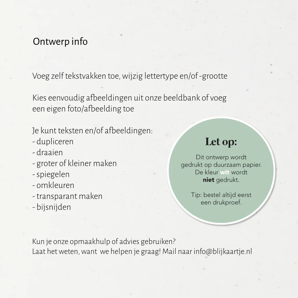 Een afbeelding met aquarel, volvlak achtergrond en het toepassen van transparantie wordt afgeraden. Wij adviseren je om, voordat je een grotere oplage bestelt, eerst een drukproef van het ontwerp te bestellen zodat je het duurzame papier gecombineerd met het drukwerk goed kunt beoordelen. LET OP: kies je voor een andere duurzaam papiersoort dan heeft dat gevolgen voor de (achtergrond)kleuren van je ontwerp.