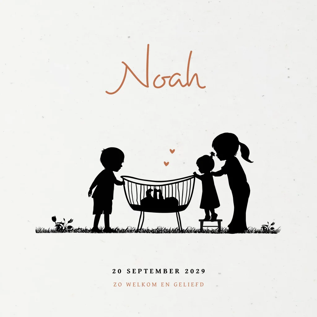Silhouet geboortekaartje op duurzaam papier voor een vierde kindje. Op dit kaartje Noah staan 3 kindjes om een wiegje heen. Pas de teksten en lettertypes naar wens aan in de editor.