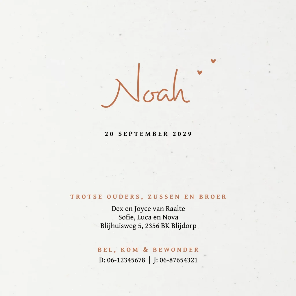 Dit geboortekaartje wordt gedrukt op gerecycled papier met zichtbare vezels. Het duurzame papier heeft een grijze ondertoon. Het papier is echter niet ruw en heeft ook geen voelbare structuur.
