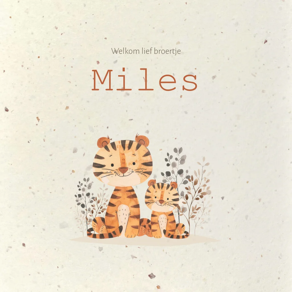 Lief duurzaam geboortekaartje voor een jongen op duurzaam Tulpenbollen papier. Op dit geboortekaartje Miles staat een illustratie van twee tijgertjes. Helemaal geschikt voor een tweede kindje dus!