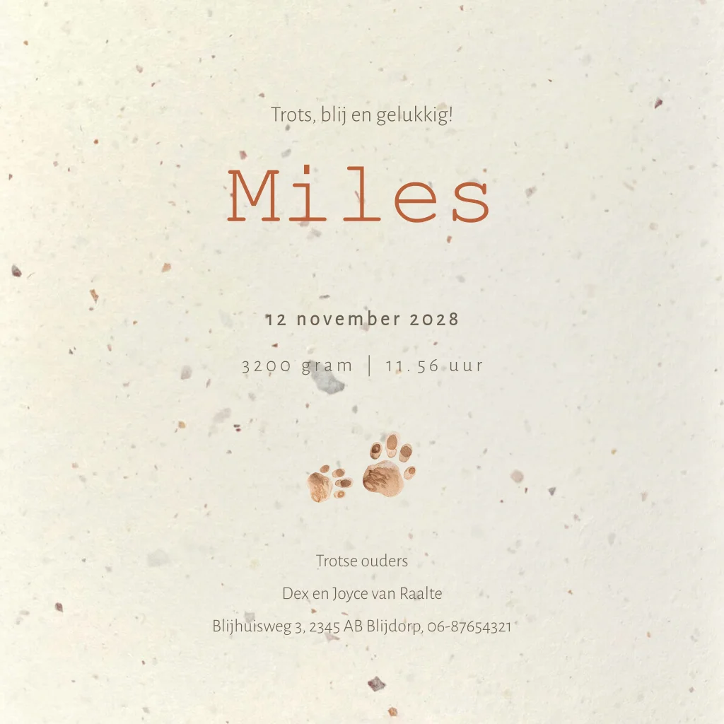 Dit kaartje is een 100% Nederlands product en wordt gedrukt op gerecycled papier welke voor 20% uit tulpenbollen bestaat, aangevuld met houtvrije cellulose. De papiersoort is beige en heeft duidelijk zichtbare vlokken en vezels. Aangezien het een natuurlijk product is kan er een uitstraling- en kleurverschil zitten tussen verschillende oplages van drukwerk. Wij adviseren je om, voordat je een grotere oplage bestelt, eerst een drukproef van het ontwerp te bestellen zodat je het duurzame papier gecombineerd met het drukwerk goed kunt beoordelen. LET OP: kies je voor een andere duurzaam papiersoort dan heeft dat gevolgen voor de (achtergrond)kleuren van je ontwerp.
