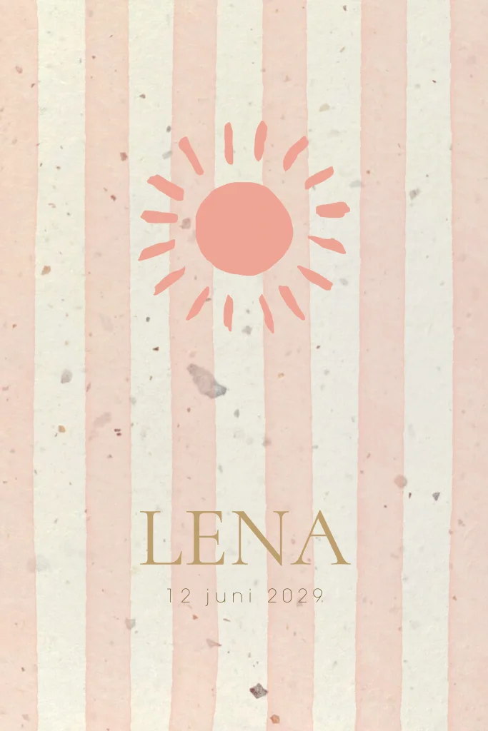 Duurzaam geboortekaartje voor een meisje. Je ziet op dit meisjes geboortekaartje Lena een strepen patroon met een vrolijke zon. Een vrolijk en opvallend geboortekaartje voor jullie dochter die zeker zal opvallen!