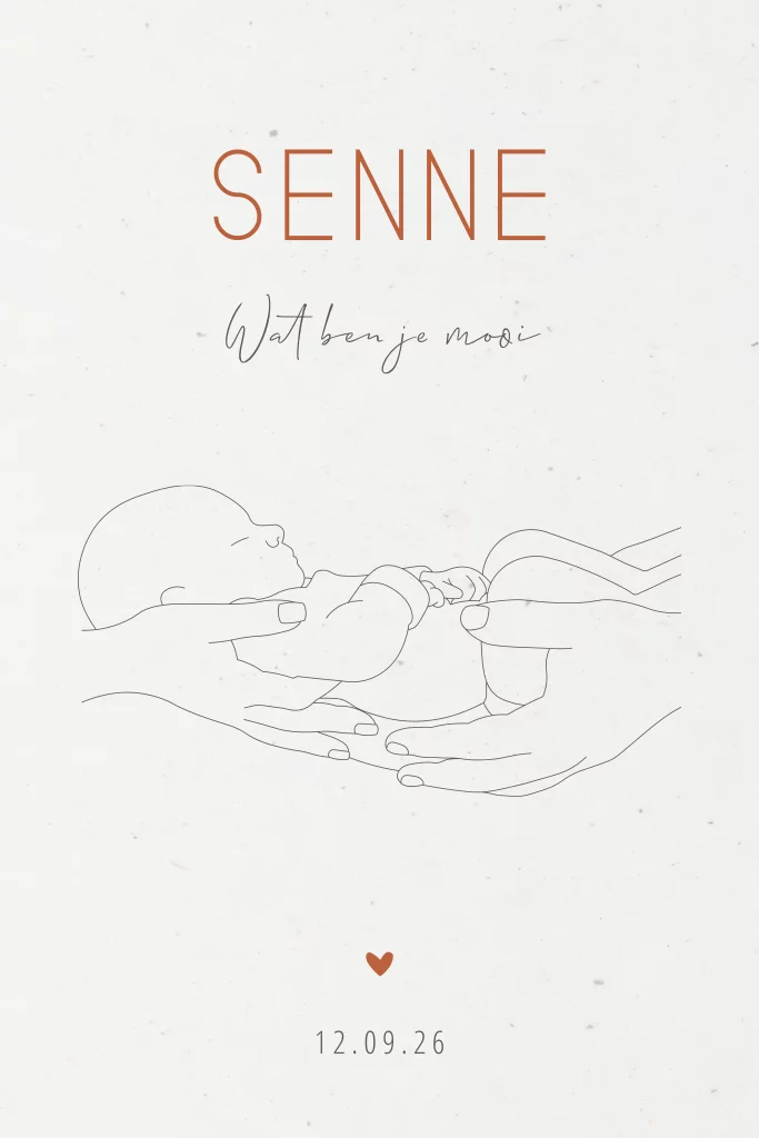 Duurzaam geboortekaartje voor een meisje of jongen (gender neutraal of unisex) dat gedrukt wordt op gerecycled papier. Dit babykaartje Senne heeft een basic design met een lijntekening van een pasgeboren baby die gedragen wordt door twee handen. De teksten en lettertypes zijn aan te passen in de editor.
