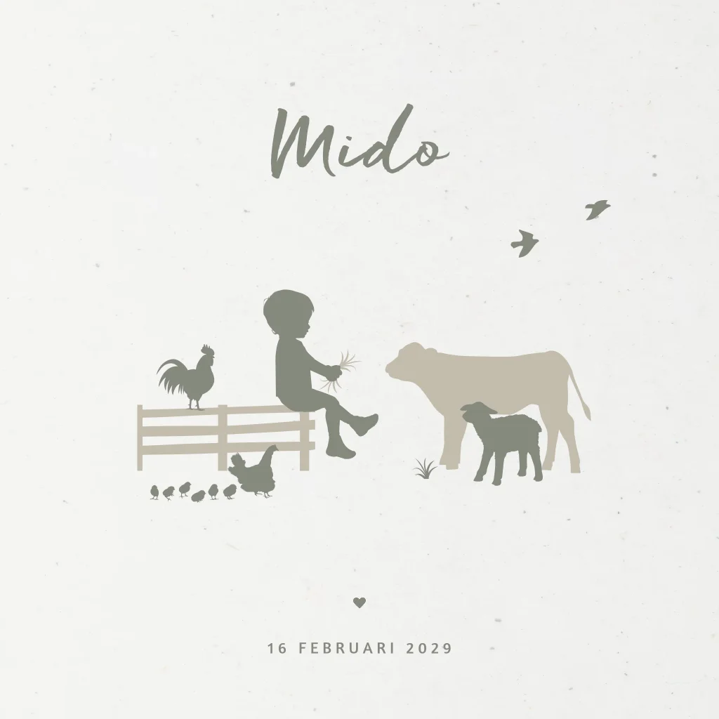 "Mido" is een duurzaam silhouet geboortekaartje voor een jongen met boerderijdieren, zoals een koe, lam, haan en kippen. Op dit babykaartje voert het jongetje de boerderijdieren. Dit jongenskaartje wordt gedrukt op gerecycled papier. De teksten en lettertypes zijn aan te passen in de editor.