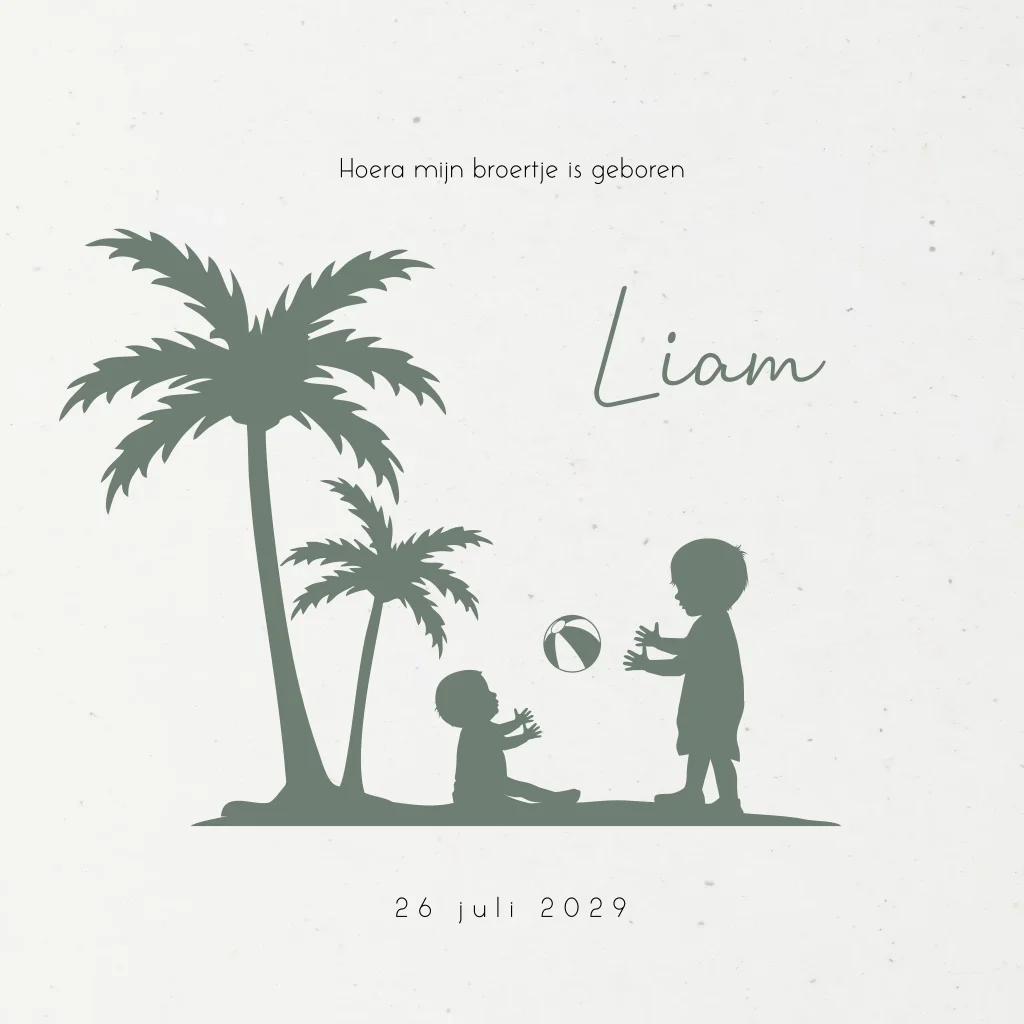 Duurzaam silhouet geboortekaartje voor een tweede kindje, een jongen. Op dit zomerse kaartje zie je 2 broers overgooien met een strandbal. Het kleine broertje zit in het zand onder een palmboom. De teksten en lettertypes, evenals het silhouet zijn aan te passen. Ook mogelijk voor een andere gezinssamenstelling.