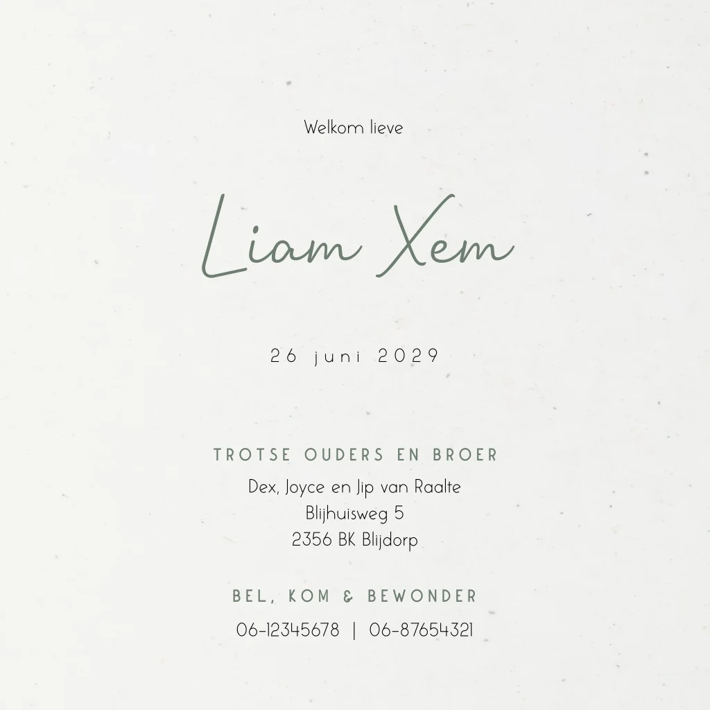 Dit geboortekaartje wordt gedrukt op gerecycled papier met zichtbare vezels. Het duurzame papier heeft een grijze ondertoon. Het papier is echter niet ruw en heeft ook geen voelbare structuur.