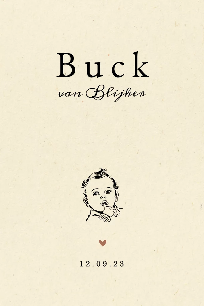 Duurzaam geboortekaartje voor een zoon dat gedrukt wordt op gerecycled papier. Dit jongenskaartje Buck heeft een basic design met een retro illustratie van een baby. De teksten en lettertypes zijn aan te passen in de editor.