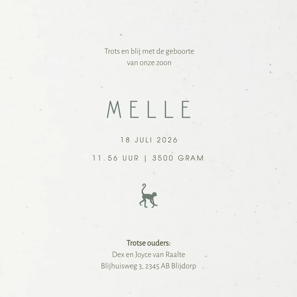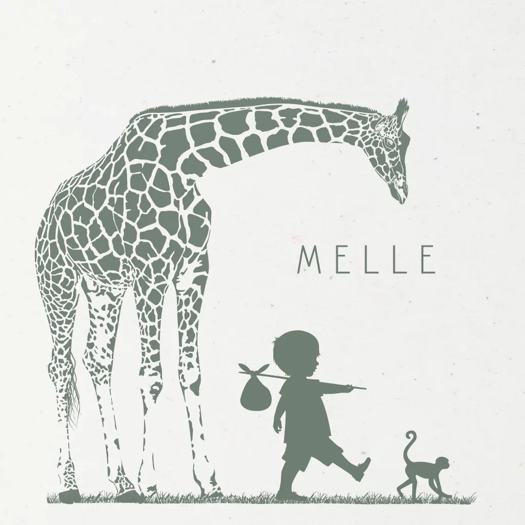 Duurzaam safari silhouet geboortekaartje voor een zoon. Op dit eco kaartje met babynaam Melle staan een silhouet van een jongen met knapzak, een giraffe en een aapje. Samen gaan ze op avontuur! Dit jongenskaartje wordt gedrukt op gerecycled papier. De teksten en lettertypes zijn aan te passen in de editor.