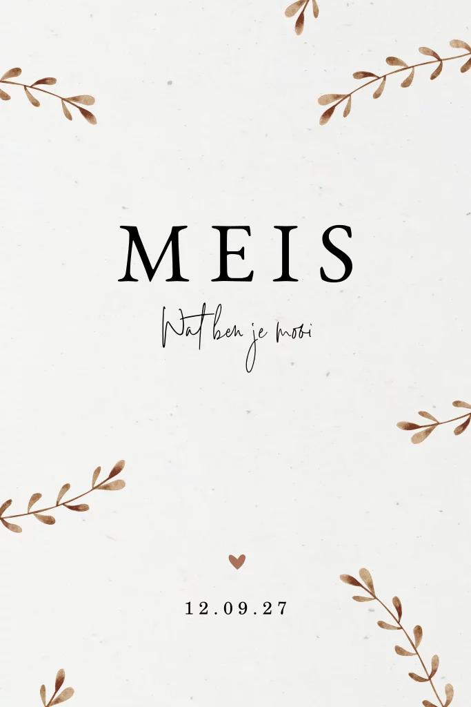 Duurzaam geboortekaartje voor een meisje dat gedrukt wordt op gerecycled papier. Dit babykaartje Meis heeft een basic design met kleine botanische takjes. De teksten en lettertypes zijn aan te passen in de editor.