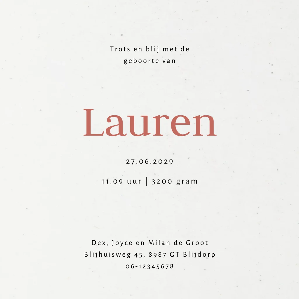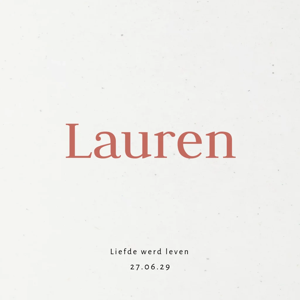 Duurzaam geboortekaartje voor een dochter met een basic en minimalistisch design. Een rustige kaart met enkel de babynaam Lauren op de voorzijde in een mooi sierlijk lettertype. De teksten en lettertypes zijn naar je eigen smaak aan te passen.