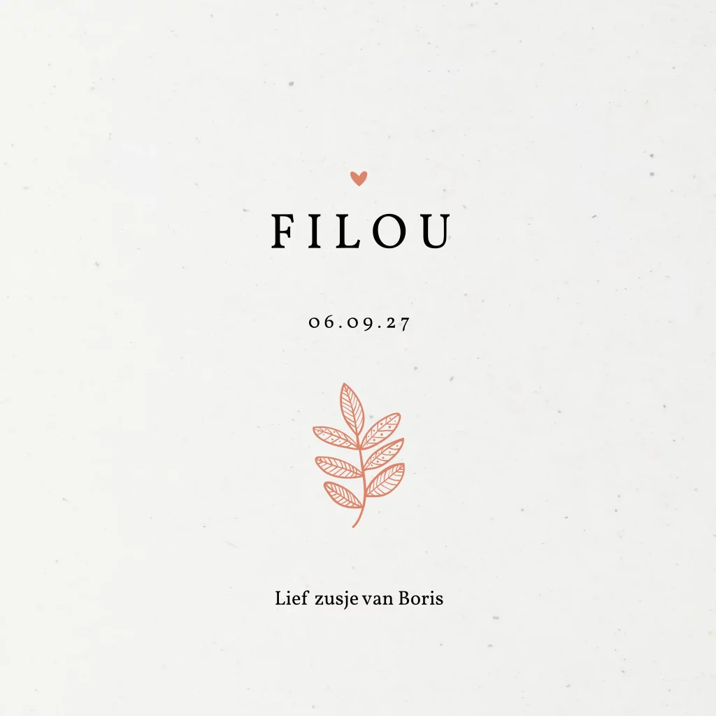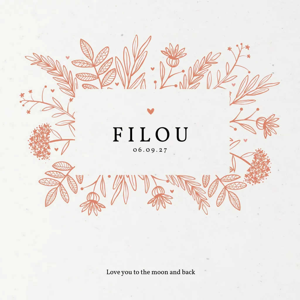 Hip duurzaam bloemen geboortekaartje voor een dochter. De babynaam Filou staat centraal op de kaart met daar omheen mooie bloem takjes. Dit meisjeskaartje wordt gedrukt op gerecycled papier. De teksten en lettertypes zijn aan te passen in de editor.