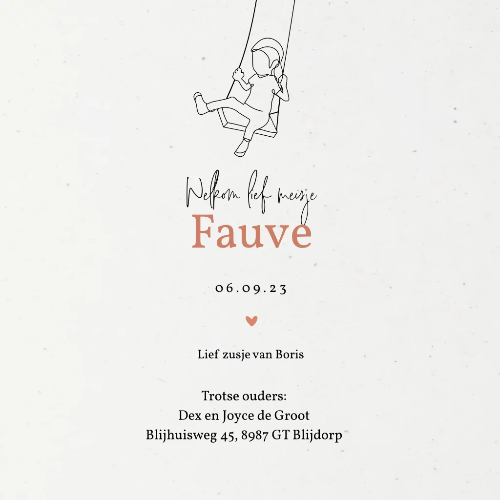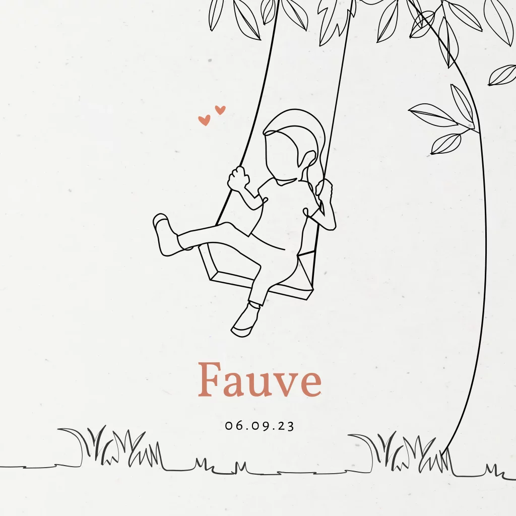 Duurzaam geboortekaartje voor een meisje welke gedrukt wordt op gerecycled papier. Op dit babykaartje Fauve, met meisje op de schommel, staan getekende one line illustraties. De teksten en lettertypes zijn aan te passen in de editor.