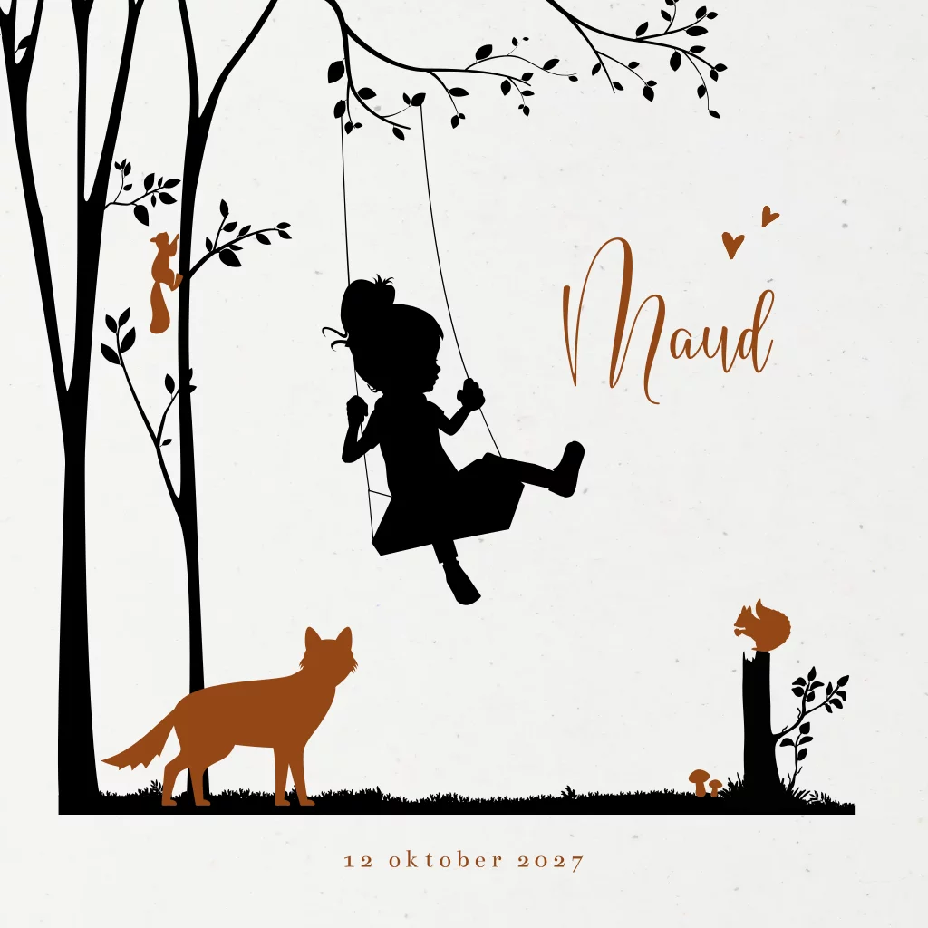 Hip geboortekaartje op duurzaam papier met een klein meisje op de schommel in het bos. Op dit herfst kaartje Maud afbeeldingen van een boom, vos, eekhoorn en paddenstoeltjes. Teksten en kleuren, evenals het silhouet zijn aan te passen in de editor.