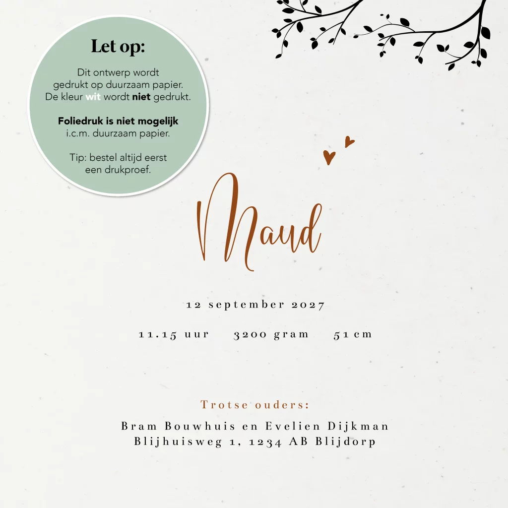 Dit geboortekaartje wordt gedrukt op gerecycled papier met zichtbare vezels. Het duurzame papier heeft een grijze ondertoon. Het papier is echter niet ruw en heeft ook geen voelbare structuur. LET OP: kies je voor een andere duurzaam papiersoort dan heeft dat gevolgen voor de (achtergrond)kleuren van je ontwerp.