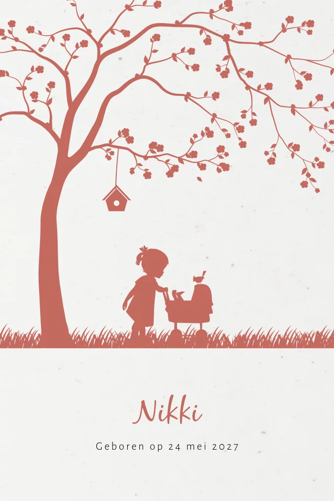 Lief duurzaam silhouet geboortekaartje voor een tweede kindje. Op dit kaartje Nikki staat een grote zus op hakjes kijkend in de kinderwagen waarin haar kleine baby broertje of zusje ligt. Dit kaartje is voor zowel een jongen als een meisje geschikt, oftewel een unisex kaartje. De teksten en kleuren zijn naar je eigen smaak aan te passen in de editor.