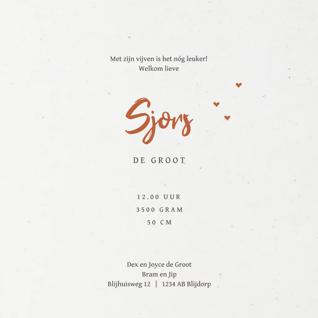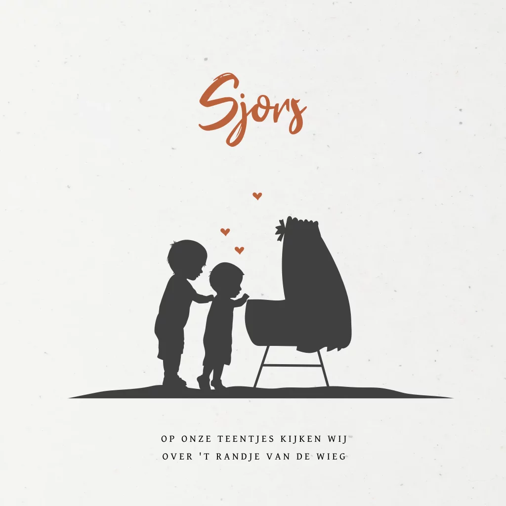 Duurzaam geboortekaartje Sjors voor een broertje of een zusje met het silhouet van 2 broers die op hun teentjes over het randje van de wieg kijken. Dit unisex kaartje voor een derde kindje is geheel te bewerken en naar je eigen smaak aan te passen. De teksten, lettertypes en de silhouetten, zijn aan te passen in de editor.