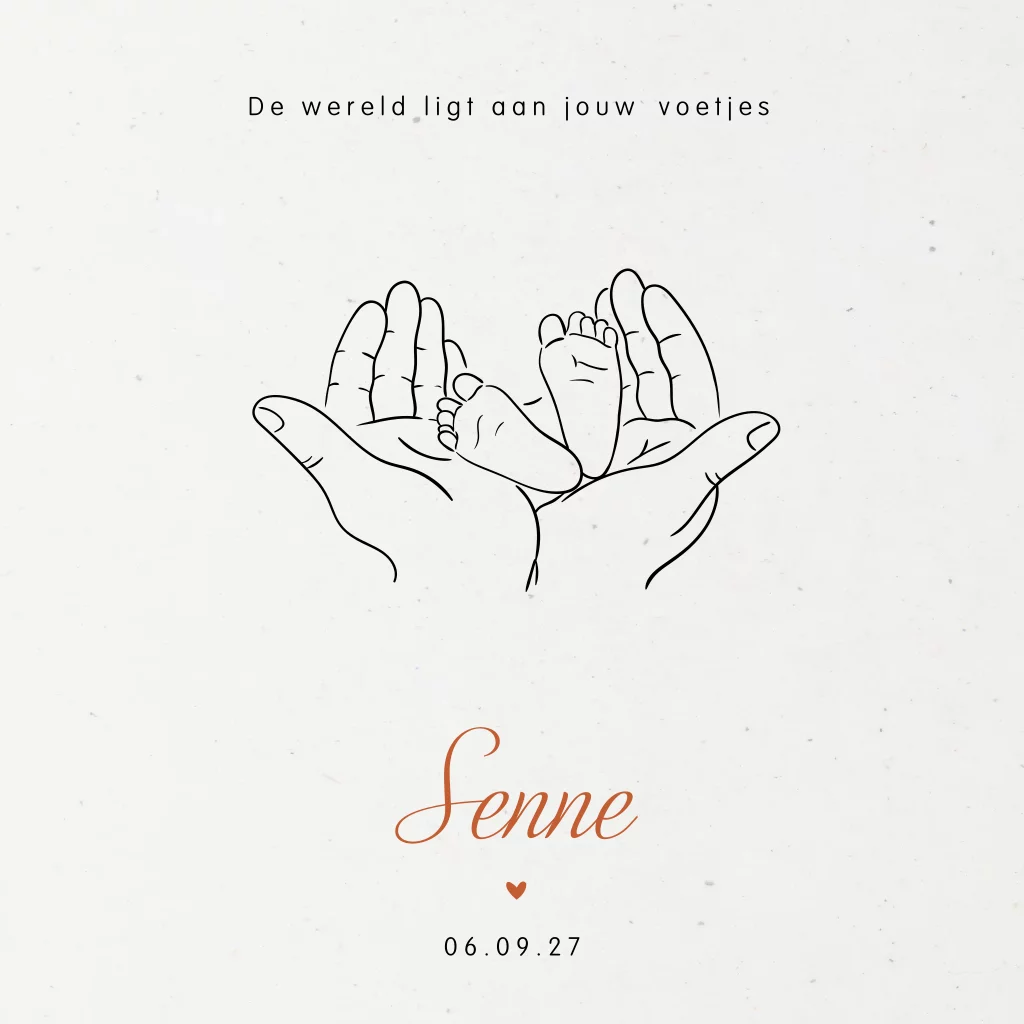 Duurzaam unisex geboortekaartje dat voor zowel een jongen als een meisje gebruikt kan worden. Op dit babykaartje Senne staat een one line illustratie van handen met daarin kleine babyvoeten. De teksten, lettertypes en kleuren zijn aan te passen in de editor.