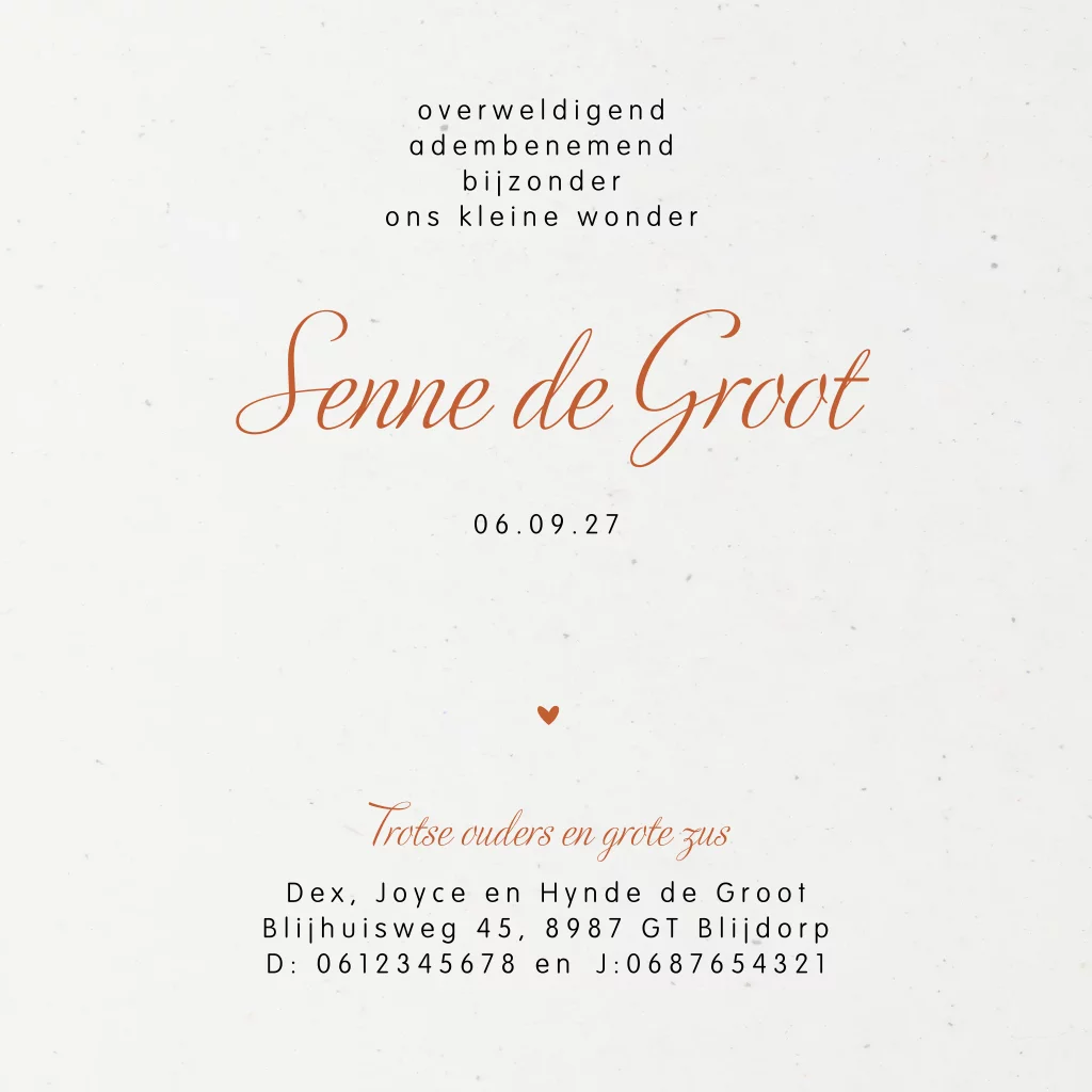 Dit geboortekaartje wordt gedrukt op gerecycled papier met zichtbare vezels. Het duurzame papier heeft een grijze ondertoon. Het papier is echter niet ruw en heeft ook geen voelbare structuur.