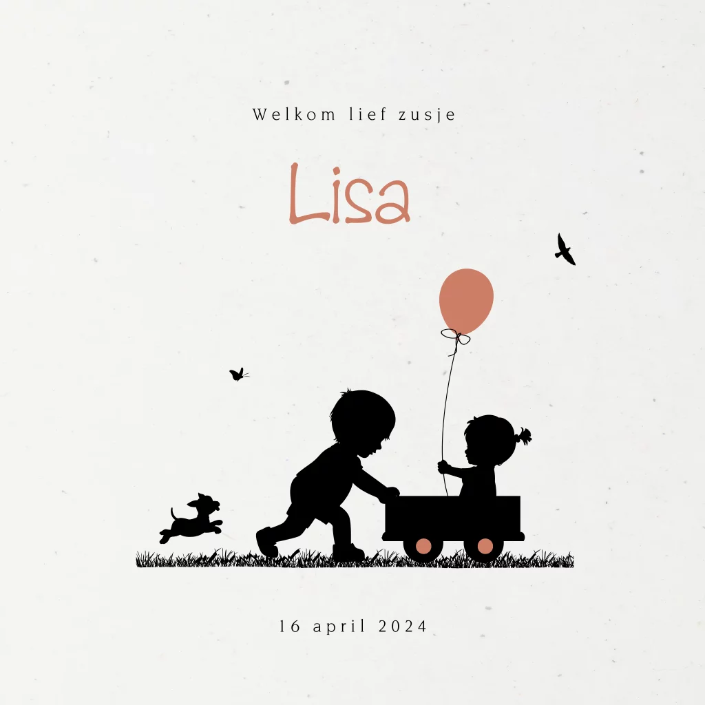 Silhouet geboortekaartje op duurzaam papier voor een tweede kindje. Op dit babykaartje Lisa staat een grote broer samen met zijn kleine zusje. Het meisje zit in een karretje met een ballon in haar hand. De teksten, kleuren en lettertypes zijn naar je eigen smaak aan te passen. Ook mogelijk met een ander silhouet.