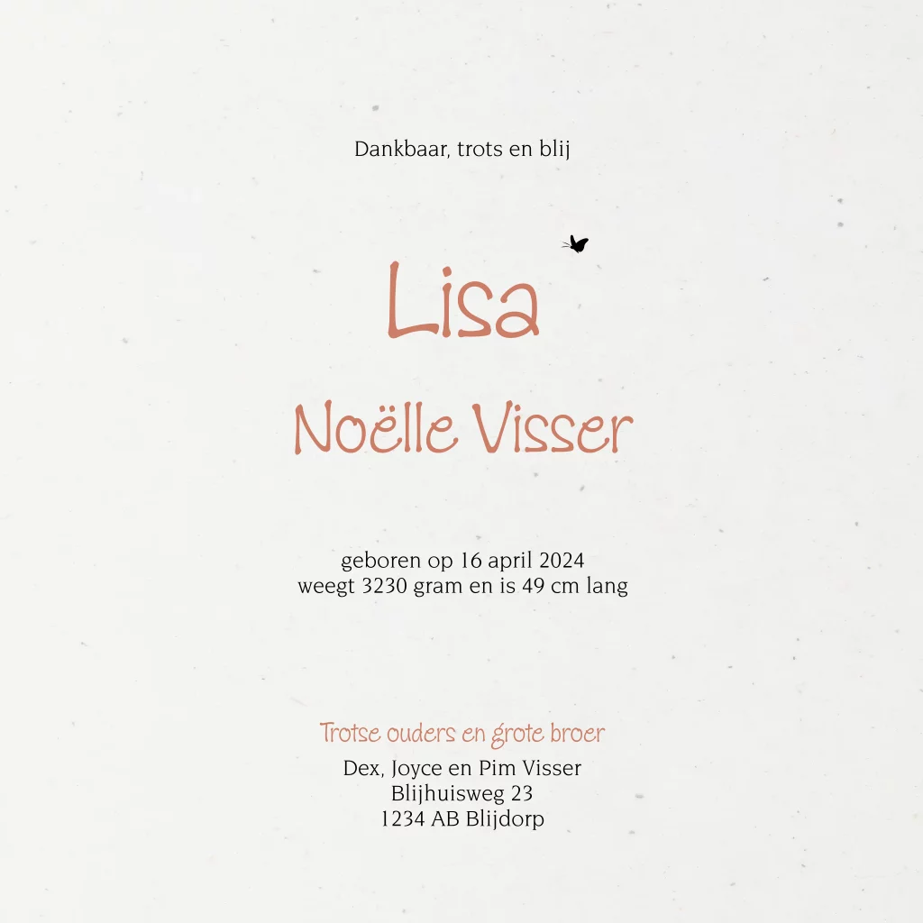 Dit geboortekaartje wordt gedrukt op gerecycled papier (20% katoen en 80% gerecyclede vezels). Het duurzame papier heeft een geel/bruine kleur met zichtbare vezels. Het papier is echter niet ruw en heeft ook geen voelbare structuur.