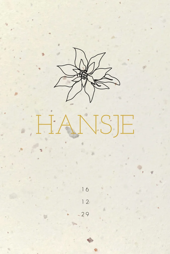 Duurzaam geboortekaartje voor een jongen of meisje met de geboortebloem van december. Je ziet op dit unisex geboortekaartje Hansje een prachtige lijntekening van een kerstster. De teksten en lettertypes zijn eenvoudig aan te passen in de editor.
