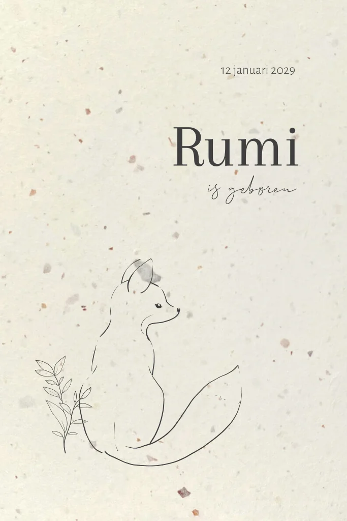 Duurzaam geboortekaartje met een lijntekening van een vosje. Dit unisex geboortekaartje Rumi heeft een basic design. De teksten en lettertypes zijn aan te passen.