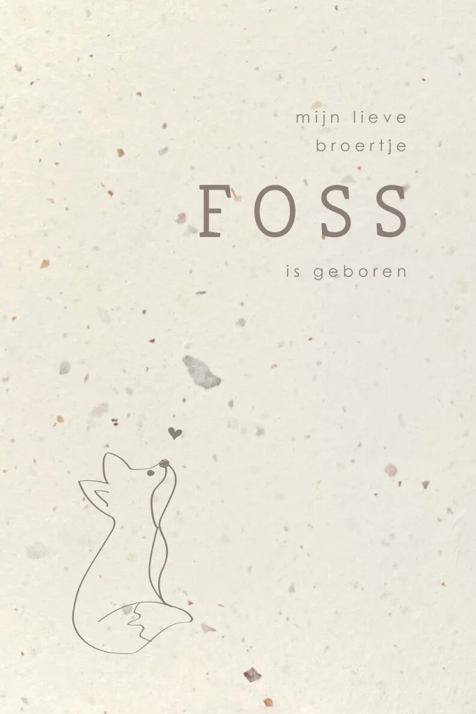 Duurzaam geboortekaartje voor een tweede kindje, een broertje of zusje. Dit unisex geboortekaartje Foss heeft een basic design met een lijntekening van een lief vosje met hartje. De teksten en lettertypes zijn aan te passen.