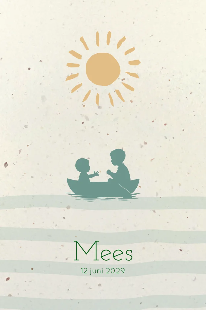 Duurzaam geboortekaartje voor een jongen, een broertje! Je ziet op dit jongens geboortekaartje Mees een schattig silhouetje van twee kindjes in een bootje. De kindjes zijn broertjes en gaan samen op avontuur onder de zon. Een vrolijk en origineel geboortekaartje die zeker zal opvallen! Dit silhouet kaartje is gemakkelijk aan te passen en ook mogelijk in een andere gezinssamenstelling. Hulp nodig? Neem contact met ons op!
