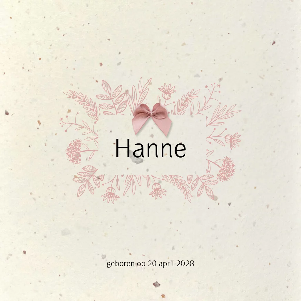 Op zoek naar een uniek en duurzaam geboortekaartje? Bekijk dan dit duurzame neutrale geboortekaartje met strikje. De naam Hanne staat in een bloemenkader in een roze kleur.