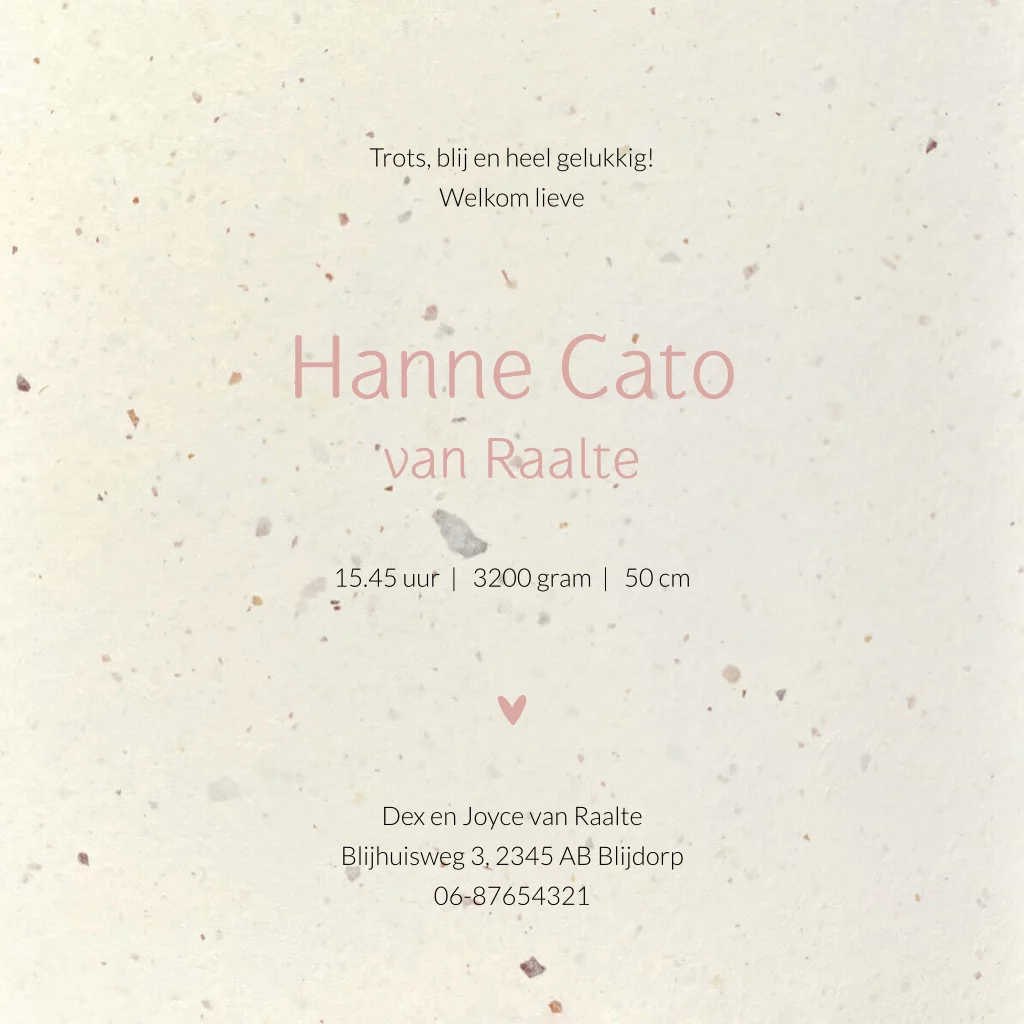 Dit geboortekaartje is een 100% Nederlands product en wordt gedrukt op gerecycled papier welke voor 20% uit tulpenbollen bestaat, aangevuld met houtvrije cellulose. De papiersoort is beige en heeft duidelijk zichtbare vlokken en vezels. Aangezien het een natuurlijk product is kan er een uitstraling- en kleurverschil zitten tussen verschillende oplages van drukwerk. Wij adviseren je om, voordat je een grotere oplage bestelt, eerst een drukproef van het ontwerp te bestellen zodat je het duurzame papier gecombineerd met het drukwerk goed kunt beoordelen. LET OP: kies je voor een andere duurzaam papiersoort dan heeft dat gevolgen voor de (achtergrond)kleuren van je ontwerp.