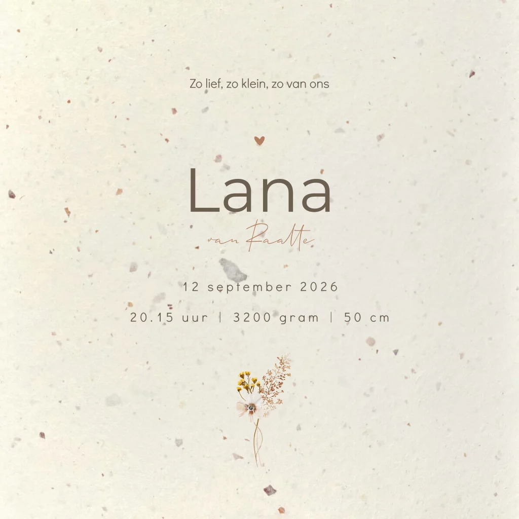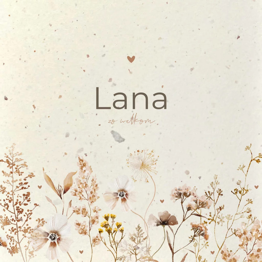 Prachtig vintagelook geboortekaartje voor een meisje op duurzaam papier van tulpenbollen. Op dit geboortekaartje Lana zie je een lief ontwerp van veldbloemen met hartjes.