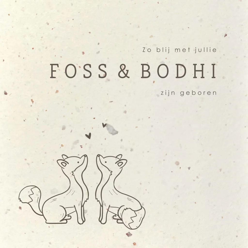 Lief duurzaam unisex geboortekaartje voor een tweeling op duurzaam papier. Op dit geboortekaartje voor een tweeling staat een lijntekening van twee lieve vosjes met hartjes.