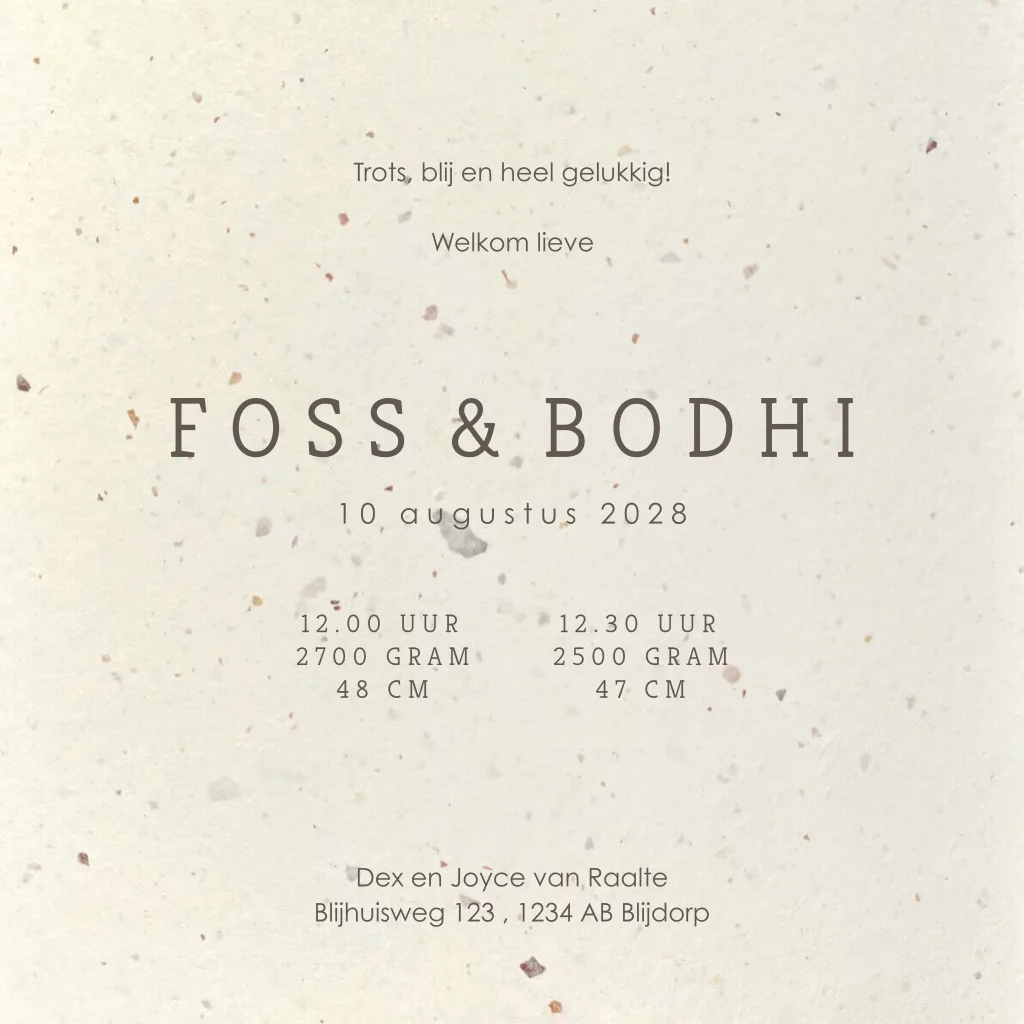 Dit tweeling geboortekaartje is een 100% Nederlands product en wordt gedrukt op gerecycled papier welke voor 20% uit tulpenbollen bestaat, aangevuld met houtvrije cellulose. De papiersoort is beige en heeft duidelijk zichtbare vlokken en vezels. Aangezien het een natuurlijk product is kan er een uitstraling- en kleurverschil zitten tussen verschillende oplages van drukwerk. Wij adviseren je om, voordat je een grotere oplage bestelt, eerst een drukproef van het ontwerp te bestellen zodat je het duurzame papier gecombineerd met het drukwerk goed kunt beoordelen. LET OP: kies je voor een andere duurzaam papiersoort dan heeft dat gevolgen voor de (achtergrond)kleuren van je ontwerp.