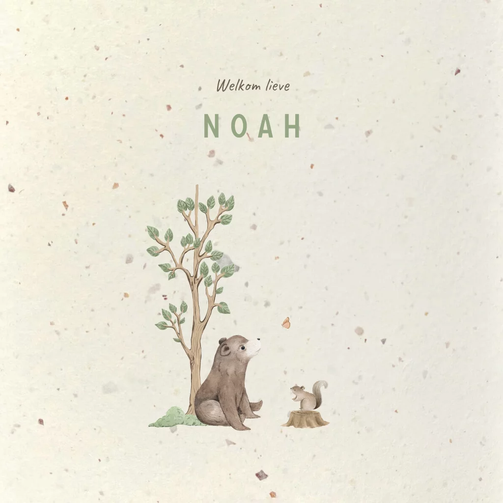 Lief duurzaam unisex geboortekaartje op duurzaam papier. Op dit geboortekaartje voor een jongen of meisje staat een illustratie van een lief beertje, zittend tegen een boom. Hij kijkt, samen met een eekhoorn, naar een vlindertje.