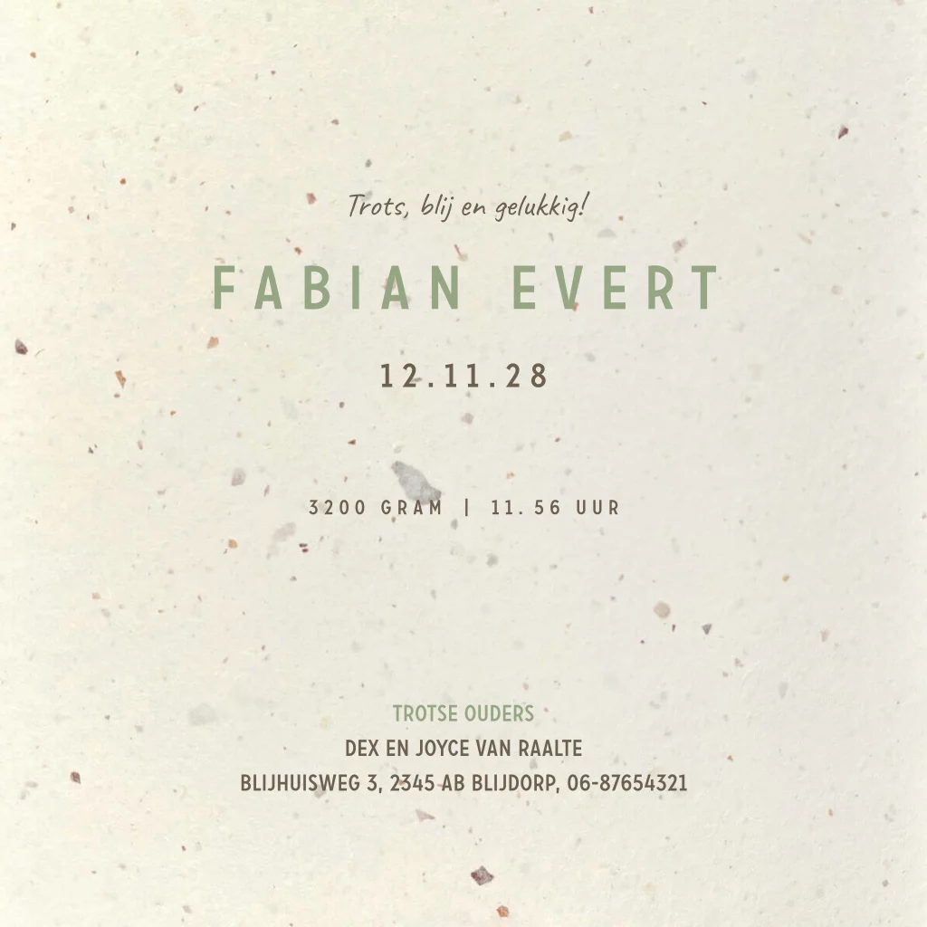 Dit kaartje is een 100% Nederlands product en wordt gedrukt op gerecycled papier welke voor 20% uit tulpenbollen bestaat, aangevuld met houtvrije cellulose. De papiersoort is beige en heeft duidelijk zichtbare vlokken en vezels. Aangezien het een natuurlijk product is kan er een uitstraling- en kleurverschil zitten tussen verschillende oplages van drukwerk. Wij adviseren je om, voordat je een grotere oplage bestelt, eerst een drukproef van het ontwerp te bestellen zodat je het duurzame papier gecombineerd met het drukwerk goed kunt beoordelen. LET OP: kies je voor een andere duurzaam papiersoort dan heeft dat gevolgen voor de (achtergrond)kleuren van je ontwerp.