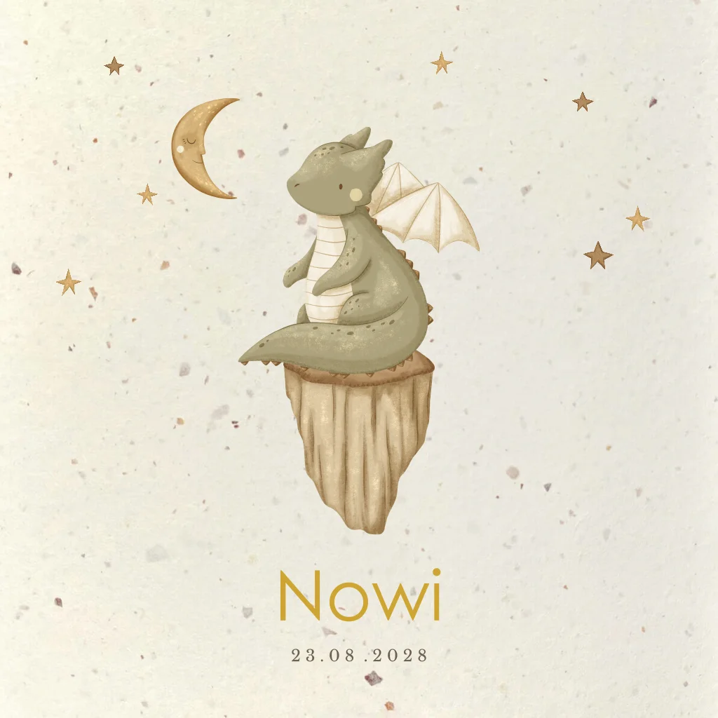 Unisex geboortekaartje op duurzaam papier. Op dit geboortekaartje voor een jongen of meisje staat een lief draakje tussen de sterren en maan.