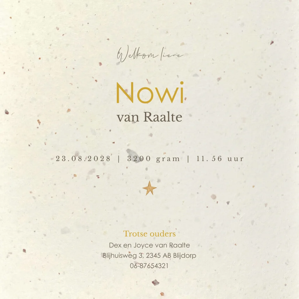 Dit geboortekaartje Nowi is een 100% Nederlands product en wordt gedrukt op gerecycled papier welke voor 20% uit tulpenbollen bestaat, aangevuld met houtvrije cellulose. De papiersoort is beige en heeft duidelijk zichtbare vlokken en vezels. Aangezien het een natuurlijk product is kan er een uitstraling- en kleurverschil zitten tussen verschillende oplages van drukwerk. Wij adviseren je om, voordat je een grotere oplage bestelt, eerst een drukproef van het ontwerp te bestellen zodat je het duurzame papier gecombineerd met het drukwerk goed kunt beoordelen. LET OP: kies je voor een andere duurzaam papiersoort dan heeft dat gevolgen voor de (achtergrond)kleuren van je ontwerp.