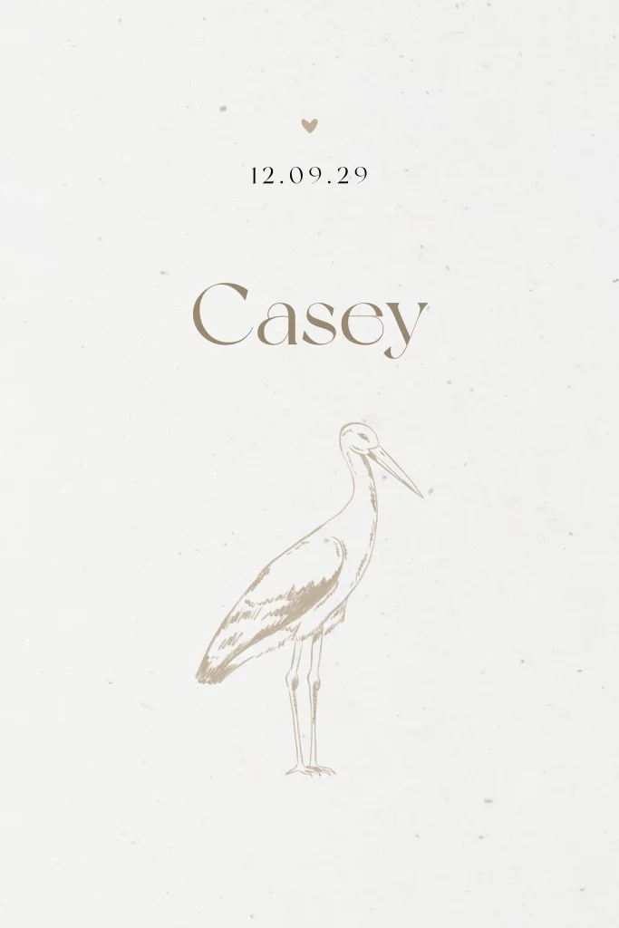 Verwachten jullie een jongen of meisje? Dit duurzame geboortekaartje Casey met een ooievaar is geschikt voor allebei! Het kaartje is ook duurzaam, want het is gemaakt van gerecycled papier. Zo draag je dus ook nog eens bij aan het milieu. Je kunt de teksten, lettertypes en kleur naar eigen wens aanpassen in de editor. Zo maak je het kaartje helemaal uniek.