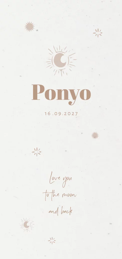 Duurzaam geboortekaartje voor een meisje. Op dit babykaartje met de naam Ponyo zie je een maan en kleine sterretjes uit de stargaze collectie van Jollein.