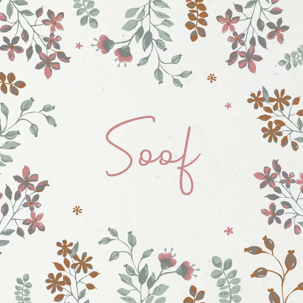 Duurzaam babykaartje Soof met romantische bloemen in de warme kleuren roze, groen en caramel.